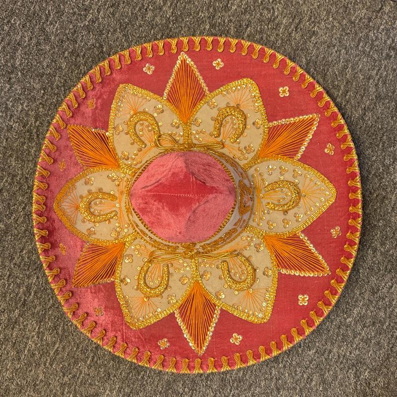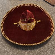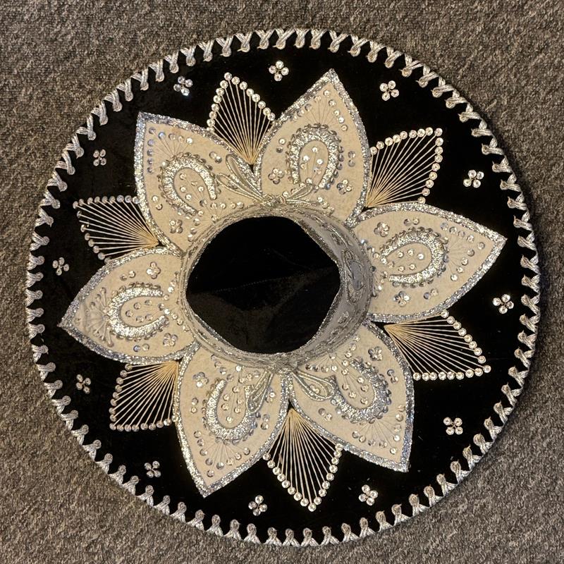 Ein Sombrero eignet sich auch für Auftritte im Theater, auf Ausstellungen und Messen, bei Pferdeshows, für Musikanten u.a.m. Schöne und besondere Dekoration für die Wand. Einzigartiger Hut für Sammler. Durchmesser 59 cm, hergestellt aus Filz auf Lochkarton-Schablonen. Gold- und Silberfäden bilden die Muster auf dem Hut. Los Sombreros bekannt aus der Mariachi-Musik